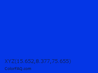 XYZ 15.652,8.377,75.655 Color is a normal blue color and the nearest color is Blue RYB #0247fe. Hex code #0436e6 and RGB value is rgb(4,54,230). In RGB color space, this color is composed of 2% red, 21% green, 90% blue, In CMYK color space, this color is composed of 98% cyan, 77% magenta, 0% yellow , 10% black , In HSL color space, this color has a hue angle of 227° , 97% saturation and 46% lightness.