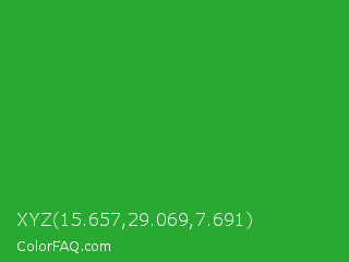 XYZ 15.657,29.069,7.691 Color is a normal green color and the nearest color is Wageningen Green #34b233. Hex code #29a931 and RGB value is rgb(41,169,49). In RGB color space, this color is composed of 16% red, 66% green, 19% blue, In CMYK color space, this color is composed of 76% cyan, 0% magenta, 71% yellow , 34% black , In HSL color space, this color has a hue angle of 124° , 61% saturation and 41% lightness.