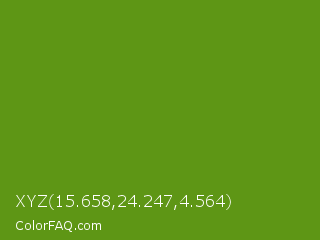 XYZ 15.658,24.247,4.564 Color is a normal green color and the nearest color is Vida Loca #549019. Hex code #5e9615 and RGB value is rgb(94,150,21). In RGB color space, this color is composed of 37% red, 59% green, 8% blue, In CMYK color space, this color is composed of 37% cyan, 0% magenta, 86% yellow , 41% black , In HSL color space, this color has a hue angle of 86° , 75% saturation and 34% lightness.
