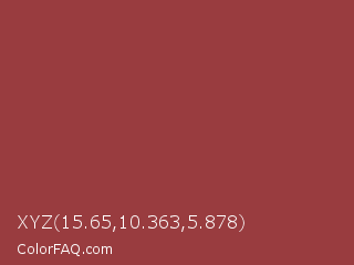 XYZ 15.65,10.363,5.878 Color is a normal red color and the nearest color is Smoky Topaz #933d41. Hex code #993c3f and RGB value is rgb(153,60,63). In RGB color space, this color is composed of 60% red, 24% green, 25% blue, In CMYK color space, this color is composed of 0% cyan, 61% magenta, 59% yellow , 40% black , In HSL color space, this color has a hue angle of 358° , 44% saturation and 42% lightness.