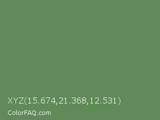XYZ 15.674,21.368,12.531 Color is a normal green color and the nearest color is Glade Green #61845f. Hex code #608a58 and RGB value is rgb(96,138,88). In RGB color space, this color is composed of 38% red, 54% green, 35% blue, In CMYK color space, this color is composed of 30% cyan, 0% magenta, 36% yellow , 46% black , In HSL color space, this color has a hue angle of 110° , 22% saturation and 44% lightness.