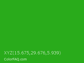 XYZ 15.675,29.676,5.939 Color is a normal green color and the nearest color is Slimy Green #299617. Hex code #29ab1b and RGB value is rgb(41,171,27). In RGB color space, this color is composed of 16% red, 67% green, 11% blue, In CMYK color space, this color is composed of 76% cyan, 0% magenta, 84% yellow , 33% black , In HSL color space, this color has a hue angle of 114° , 73% saturation and 39% lightness.