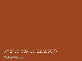 XYZ 15.689,11.22,2.567 Color is a normal orange color and the nearest color is Cumin #924321. Hex code #9a451e and RGB value is rgb(154,69,30). In RGB color space, this color is composed of 60% red, 27% green, 12% blue, In CMYK color space, this color is composed of 0% cyan, 55% magenta, 81% yellow , 40% black , In HSL color space, this color has a hue angle of 19° , 67% saturation and 36% lightness.
