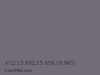 XYZ 15.692,15.659,19.965 Color is a normal violet color and the nearest color is Fedora #796a78. Hex code #726c78 and RGB value is rgb(114,108,120). In RGB color space, this color is composed of 45% red, 42% green, 47% blue, In CMYK color space, this color is composed of 5% cyan, 10% magenta, 0% yellow , 53% black , In HSL color space, this color has a hue angle of 270° , 5% saturation and 45% lightness.