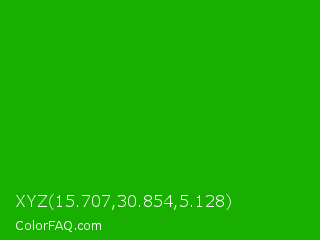 XYZ 15.707,30.854,5.128 Color is a normal green color and the nearest color is Slimy Green #299617. Hex code #18af00 and RGB value is rgb(24,175,0). In RGB color space, this color is composed of 9% red, 69% green, 0% blue, In CMYK color space, this color is composed of 86% cyan, 0% magenta, 100% yellow , 31% black , In HSL color space, this color has a hue angle of 112° , 100% saturation and 34% lightness.