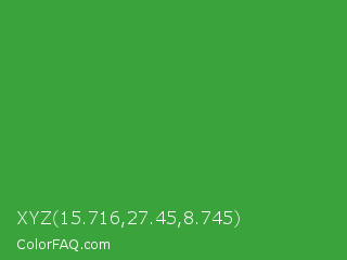 XYZ 15.716,27.45,8.745 Color is a normal green color and the nearest color is Wageningen Green #34b233. Hex code #3ba33c and RGB value is rgb(59,163,60). In RGB color space, this color is composed of 23% red, 64% green, 24% blue, In CMYK color space, this color is composed of 64% cyan, 0% magenta, 63% yellow , 36% black , In HSL color space, this color has a hue angle of 121° , 47% saturation and 44% lightness.
