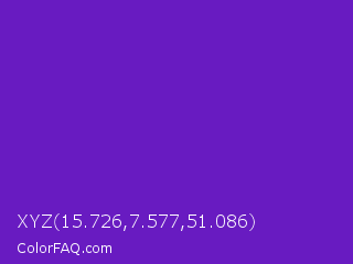 XYZ 15.726,7.577,51.086 Color is a normal violet color and the nearest color is Purple Heart Crayola #652dc1. Hex code #681bc1 and RGB value is rgb(104,27,193). In RGB color space, this color is composed of 41% red, 11% green, 76% blue, In CMYK color space, this color is composed of 46% cyan, 86% magenta, 0% yellow , 24% black , In HSL color space, this color has a hue angle of 268° , 75% saturation and 43% lightness.
