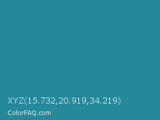 XYZ 15.732,20.919,34.219 Color is a normal cyan color and the nearest color is Jelly Bean #297b9a. Hex code #248a9b and RGB value is rgb(36,138,155). In RGB color space, this color is composed of 14% red, 54% green, 61% blue, In CMYK color space, this color is composed of 77% cyan, 11% magenta, 0% yellow , 39% black , In HSL color space, this color has a hue angle of 189° , 62% saturation and 37% lightness.