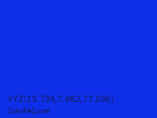 XYZ 15.739,7.882,77.036 Color is a normal blue color and the nearest color is Bluebonnet #1c1cf0. Hex code #0f2ee8 and RGB value is rgb(15,46,232). In RGB color space, this color is composed of 6% red, 18% green, 91% blue, In CMYK color space, this color is composed of 94% cyan, 80% magenta, 0% yellow , 9% black , In HSL color space, this color has a hue angle of 231° , 88% saturation and 48% lightness.