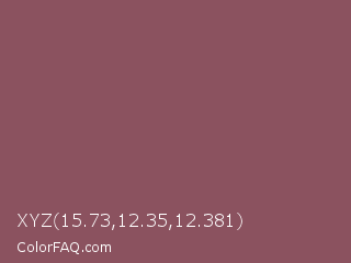 XYZ 15.73,12.35,12.381 Color is a normal red color and the nearest color is Rose Taupe #905d5d. Hex code #8b525f and RGB value is rgb(139,82,95). In RGB color space, this color is composed of 55% red, 32% green, 37% blue, In CMYK color space, this color is composed of 0% cyan, 41% magenta, 32% yellow , 45% black , In HSL color space, this color has a hue angle of 346° , 26% saturation and 43% lightness.