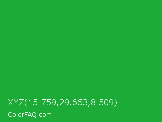 XYZ 15.759,29.663,8.509 Color is a normal green color and the nearest color is Wageningen Green #34b233. Hex code #1dab37 and RGB value is rgb(29,171,55). In RGB color space, this color is composed of 11% red, 67% green, 22% blue, In CMYK color space, this color is composed of 83% cyan, 0% magenta, 68% yellow , 33% black , In HSL color space, this color has a hue angle of 131° , 71% saturation and 39% lightness.