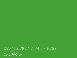 XYZ 15.787,27.247,7.676 Color is a normal green color and the nearest color is Apple #4fa83d. Hex code #42a234 and RGB value is rgb(66,162,52). In RGB color space, this color is composed of 26% red, 64% green, 20% blue, In CMYK color space, this color is composed of 59% cyan, 0% magenta, 68% yellow , 36% black , In HSL color space, this color has a hue angle of 112° , 51% saturation and 42% lightness.