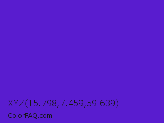 XYZ 15.798,7.459,59.639 Color is a normal indigo color and the nearest color is Purple Heart Crayola #652dc1. Hex code #591ccf and RGB value is rgb(89,28,207). In RGB color space, this color is composed of 35% red, 11% green, 81% blue, In CMYK color space, this color is composed of 57% cyan, 86% magenta, 0% yellow , 19% black , In HSL color space, this color has a hue angle of 260° , 76% saturation and 46% lightness.