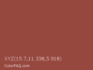 XYZ 15.7,11.338,5.918 Color is a normal red color and the nearest color is Copper Rust #944747. Hex code #96473e and RGB value is rgb(150,71,62). In RGB color space, this color is composed of 59% red, 28% green, 24% blue, In CMYK color space, this color is composed of 0% cyan, 53% magenta, 59% yellow , 41% black , In HSL color space, this color has a hue angle of 6° , 42% saturation and 42% lightness.