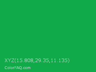 XYZ 15.808,29.35,11.135 Color is a normal green color and the nearest color is Green Pantone #00ad43. Hex code #11aa49 and RGB value is rgb(17,170,73). In RGB color space, this color is composed of 7% red, 67% green, 29% blue, In CMYK color space, this color is composed of 90% cyan, 0% magenta, 57% yellow , 33% black , In HSL color space, this color has a hue angle of 142° , 82% saturation and 37% lightness.
