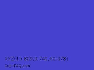 XYZ 15.809,9.741,60.078 Color is a normal indigo color and the nearest color is Iris #5a4fcf. Hex code #4742cf and RGB value is rgb(71,66,207). In RGB color space, this color is composed of 28% red, 26% green, 81% blue, In CMYK color space, this color is composed of 66% cyan, 68% magenta, 0% yellow , 19% black , In HSL color space, this color has a hue angle of 242° , 59% saturation and 54% lightness.