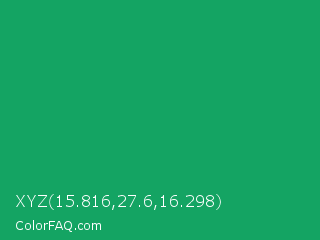 XYZ 15.816,27.6,16.298 Color is a normal green color and the nearest color is Green Haze #01a368. Hex code #14a463 and RGB value is rgb(20,164,99). In RGB color space, this color is composed of 8% red, 64% green, 39% blue, In CMYK color space, this color is composed of 88% cyan, 0% magenta, 40% yellow , 36% black , In HSL color space, this color has a hue angle of 153° , 78% saturation and 36% lightness.