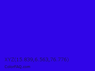 XYZ 15.839,6.563,76.776 Color is a normal indigo color and the nearest color is Electric Ultramarine #3f00ff. Hex code #3005e8 and RGB value is rgb(48,5,232). In RGB color space, this color is composed of 19% red, 2% green, 91% blue, In CMYK color space, this color is composed of 79% cyan, 98% magenta, 0% yellow , 9% black , In HSL color space, this color has a hue angle of 251° , 96% saturation and 46% lightness.