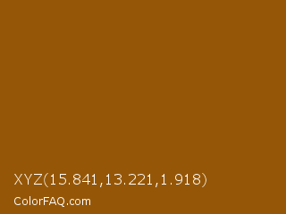 XYZ 15.841,13.221,1.918 Color is a normal orange color and the nearest color is Chelsea Gem #9e5302. Hex code #955707 and RGB value is rgb(149,87,7). In RGB color space, this color is composed of 58% red, 34% green, 3% blue, In CMYK color space, this color is composed of 0% cyan, 42% magenta, 95% yellow , 42% black , In HSL color space, this color has a hue angle of 34° , 91% saturation and 31% lightness.