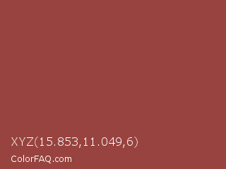XYZ 15.853,11.049,6 Color is a normal red color and the nearest color is Smoky Topaz #933d41. Hex code #98433f and RGB value is rgb(152,67,63). In RGB color space, this color is composed of 60% red, 26% green, 25% blue, In CMYK color space, this color is composed of 0% cyan, 56% magenta, 59% yellow , 40% black , In HSL color space, this color has a hue angle of 3° , 41% saturation and 42% lightness.