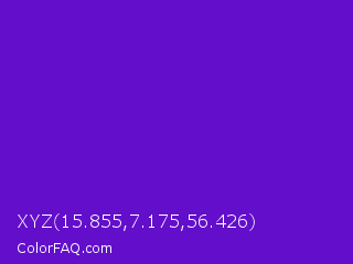 XYZ 15.855,7.175,56.426 Color is a normal violet color and the nearest color is Purple Heart Crayola #652dc1. Hex code #620eca and RGB value is rgb(98,14,202). In RGB color space, this color is composed of 38% red, 5% green, 79% blue, In CMYK color space, this color is composed of 51% cyan, 93% magenta, 0% yellow , 21% black , In HSL color space, this color has a hue angle of 267° , 87% saturation and 42% lightness.