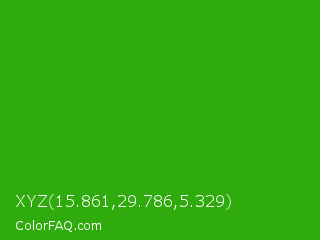 XYZ 15.861,29.786,5.329 Color is a normal green color and the nearest color is Slimy Green #299617. Hex code #30ab0e and RGB value is rgb(48,171,14). In RGB color space, this color is composed of 19% red, 67% green, 5% blue, In CMYK color space, this color is composed of 72% cyan, 0% magenta, 92% yellow , 33% black , In HSL color space, this color has a hue angle of 107° , 85% saturation and 36% lightness.