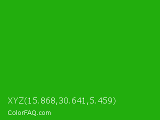 XYZ 15.868,30.641,5.459 Color is a normal green color and the nearest color is Slimy Green #299617. Hex code #22ae0d and RGB value is rgb(34,174,13). In RGB color space, this color is composed of 13% red, 68% green, 5% blue, In CMYK color space, this color is composed of 80% cyan, 0% magenta, 93% yellow , 32% black , In HSL color space, this color has a hue angle of 112° , 86% saturation and 37% lightness.