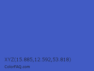 XYZ 15.885,12.592,53.818 Color is a normal blue color and the nearest color is Indigo #4f69c6. Hex code #415bc4 and RGB value is rgb(65,91,196). In RGB color space, this color is composed of 25% red, 36% green, 77% blue, In CMYK color space, this color is composed of 67% cyan, 54% magenta, 0% yellow , 23% black , In HSL color space, this color has a hue angle of 228° , 53% saturation and 51% lightness.
