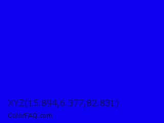 XYZ 15.894,6.377,82.831 Color is a normal indigo color and the nearest color is Blue #0000ff. Hex code #0d00f0 and RGB value is rgb(13,0,240). In RGB color space, this color is composed of 5% red, 0% green, 94% blue, In CMYK color space, this color is composed of 95% cyan, 100% magenta, 0% yellow , 6% black , In HSL color space, this color has a hue angle of 243° , 100% saturation and 47% lightness.