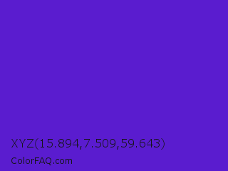 XYZ 15.894,7.509,59.643 Color is a normal violet color and the nearest color is Purple Heart Crayola #652dc1. Hex code #5a1ccf and RGB value is rgb(90,28,207). In RGB color space, this color is composed of 35% red, 11% green, 81% blue, In CMYK color space, this color is composed of 57% cyan, 86% magenta, 0% yellow , 19% black , In HSL color space, this color has a hue angle of 261° , 76% saturation and 46% lightness.