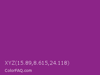 XYZ 15.89,8.615,24.118 Color is a normal magenta color and the nearest color is Razzmic Berry Crayola #843179. Hex code #8c2488 and RGB value is rgb(140,36,136). In RGB color space, this color is composed of 55% red, 14% green, 53% blue, In CMYK color space, this color is composed of 0% cyan, 74% magenta, 3% yellow , 45% black , In HSL color space, this color has a hue angle of 302° , 59% saturation and 35% lightness.
