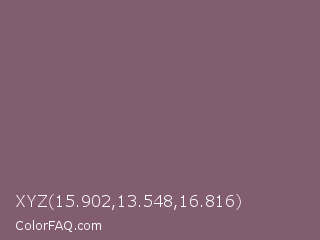 XYZ 15.902,13.548,16.816 Color is a normal rose color and the nearest color is Falcon #7f626d. Hex code #825c6f and RGB value is rgb(130,92,111). In RGB color space, this color is composed of 51% red, 36% green, 44% blue, In CMYK color space, this color is composed of 0% cyan, 29% magenta, 15% yellow , 49% black , In HSL color space, this color has a hue angle of 330° , 17% saturation and 44% lightness.
