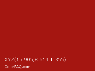 XYZ 15.905,8.614,1.355 Color is a normal red color and the nearest color is Spartan Crimson #9e1316. Hex code #a51611 and RGB value is rgb(165,22,17). In RGB color space, this color is composed of 65% red, 9% green, 7% blue, In CMYK color space, this color is composed of 0% cyan, 87% magenta, 90% yellow , 35% black , In HSL color space, this color has a hue angle of 2° , 81% saturation and 36% lightness.