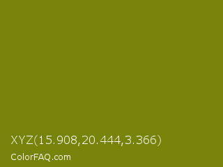 XYZ 15.908,20.444,3.366 Color is a dark yellow color and the nearest color is Olive #808000. Hex code #778409 and RGB value is rgb(119,132,9). In RGB color space, this color is composed of 47% red, 52% green, 4% blue, In CMYK color space, this color is composed of 10% cyan, 0% magenta, 93% yellow , 48% black , In HSL color space, this color has a hue angle of 66° , 87% saturation and 28% lightness.