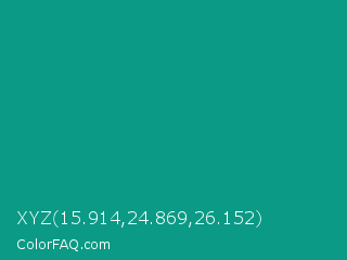 XYZ 15.914,24.869,26.152 Color is a normal cyan color and the nearest color is Gossamer #069b81. Hex code #0a9a85 and RGB value is rgb(10,154,133). In RGB color space, this color is composed of 4% red, 60% green, 52% blue, In CMYK color space, this color is composed of 94% cyan, 0% magenta, 14% yellow , 40% black , In HSL color space, this color has a hue angle of 171° , 88% saturation and 32% lightness.