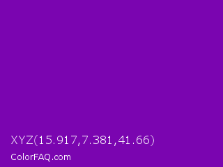 XYZ 15.917,7.381,41.66 Color is a normal purple color and the nearest color is Violet RYB #8601af. Hex code #7a05b0 and RGB value is rgb(122,5,176). In RGB color space, this color is composed of 48% red, 2% green, 69% blue, In CMYK color space, this color is composed of 31% cyan, 97% magenta, 0% yellow , 31% black , In HSL color space, this color has a hue angle of 281° , 94% saturation and 35% lightness.