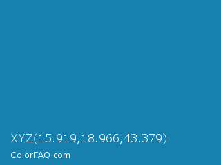 XYZ 15.919,18.966,43.379 Color is a normal blue color and the nearest color is Cyan Cornflower Blue #188bc2. Hex code #1681af and RGB value is rgb(22,129,175). In RGB color space, this color is composed of 9% red, 51% green, 69% blue, In CMYK color space, this color is composed of 87% cyan, 26% magenta, 0% yellow , 31% black , In HSL color space, this color has a hue angle of 198° , 78% saturation and 39% lightness.