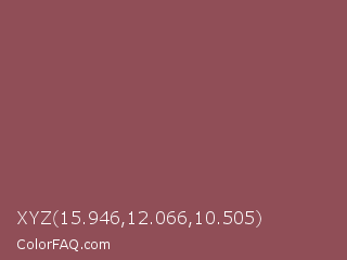 XYZ 15.946,12.066,10.505 Color is a normal red color and the nearest color is Rose Taupe #905d5d. Hex code #904e57 and RGB value is rgb(144,78,87). In RGB color space, this color is composed of 56% red, 31% green, 34% blue, In CMYK color space, this color is composed of 0% cyan, 46% magenta, 40% yellow , 44% black , In HSL color space, this color has a hue angle of 352° , 30% saturation and 44% lightness.