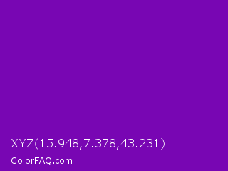 XYZ 15.948,7.378,43.231 Color is a normal purple color and the nearest color is Violet RYB #8601af. Hex code #7806b3 and RGB value is rgb(120,6,179). In RGB color space, this color is composed of 47% red, 2% green, 70% blue, In CMYK color space, this color is composed of 33% cyan, 97% magenta, 0% yellow , 30% black , In HSL color space, this color has a hue angle of 280° , 94% saturation and 36% lightness.