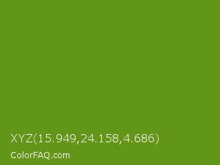 XYZ 15.949,24.158,4.686 Color is a normal green color and the nearest color is Vida Loca #549019. Hex code #629518 and RGB value is rgb(98,149,24). In RGB color space, this color is composed of 38% red, 58% green, 9% blue, In CMYK color space, this color is composed of 34% cyan, 0% magenta, 84% yellow , 42% black , In HSL color space, this color has a hue angle of 84° , 72% saturation and 34% lightness.