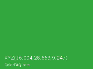 XYZ 16.004,28.663,9.247 Color is a normal green color and the nearest color is Wageningen Green #34b233. Hex code #32a73e and RGB value is rgb(50,167,62). In RGB color space, this color is composed of 20% red, 65% green, 24% blue, In CMYK color space, this color is composed of 70% cyan, 0% magenta, 63% yellow , 35% black , In HSL color space, this color has a hue angle of 126° , 54% saturation and 43% lightness.