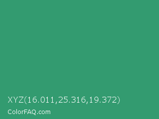 XYZ 16.011,25.316,19.372 Color is a normal green color and the nearest color is Illuminating Emerald #319177. Hex code #339b70 and RGB value is rgb(51,155,112). In RGB color space, this color is composed of 20% red, 61% green, 44% blue, In CMYK color space, this color is composed of 67% cyan, 0% magenta, 28% yellow , 39% black , In HSL color space, this color has a hue angle of 155° , 50% saturation and 40% lightness.