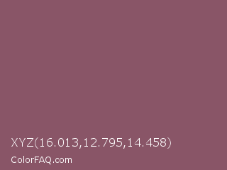 XYZ 16.013,12.795,14.458 Color is a normal rose color and the nearest color is Twilight Lavender #8a496b. Hex code #895567 and RGB value is rgb(137,85,103). In RGB color space, this color is composed of 54% red, 33% green, 40% blue, In CMYK color space, this color is composed of 0% cyan, 38% magenta, 25% yellow , 46% black , In HSL color space, this color has a hue angle of 339° , 23% saturation and 44% lightness.