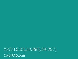 XYZ 16.02,23.885,29.357 Color is a normal cyan color and the nearest color is Blue Chill #0c8990. Hex code #11968e and RGB value is rgb(17,150,142). In RGB color space, this color is composed of 7% red, 59% green, 56% blue, In CMYK color space, this color is composed of 89% cyan, 0% magenta, 5% yellow , 41% black , In HSL color space, this color has a hue angle of 176° , 80% saturation and 33% lightness.