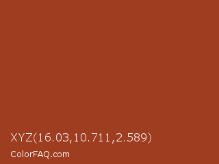 XYZ 16.03,10.711,2.589 Color is a normal red color and the nearest color is Cognac #9f381d. Hex code #9e3d20 and RGB value is rgb(158,61,32). In RGB color space, this color is composed of 62% red, 24% green, 13% blue, In CMYK color space, this color is composed of 0% cyan, 61% magenta, 80% yellow , 38% black , In HSL color space, this color has a hue angle of 14° , 66% saturation and 37% lightness.