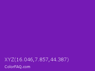 XYZ 16.046,7.857,44.387 Color is a normal purple color and the nearest color is Grape #6f2da8. Hex code #751ab5 and RGB value is rgb(117,26,181). In RGB color space, this color is composed of 46% red, 10% green, 71% blue, In CMYK color space, this color is composed of 35% cyan, 86% magenta, 0% yellow , 29% black , In HSL color space, this color has a hue angle of 275° , 75% saturation and 41% lightness.