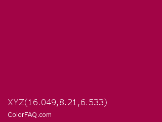 XYZ 16.049,8.21,6.533 Color is a normal rose color and the nearest color is Pink Raspberry #980036. Hex code #a20446 and RGB value is rgb(162,4,70). In RGB color space, this color is composed of 64% red, 2% green, 27% blue, In CMYK color space, this color is composed of 0% cyan, 98% magenta, 57% yellow , 36% black , In HSL color space, this color has a hue angle of 335° , 95% saturation and 33% lightness.