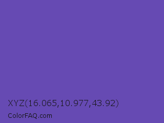 XYZ 16.065,10.977,43.92 Color is a normal indigo color and the nearest color is Studio #714ab2. Hex code #664ab3 and RGB value is rgb(102,74,179). In RGB color space, this color is composed of 40% red, 29% green, 70% blue, In CMYK color space, this color is composed of 43% cyan, 59% magenta, 0% yellow , 30% black , In HSL color space, this color has a hue angle of 256° , 42% saturation and 50% lightness.