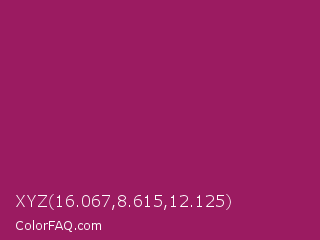 XYZ 16.067,8.615,12.125 Color is a normal magenta color and the nearest color is Amaranth Deep Purple #9f2b68. Hex code #9b1b61 and RGB value is rgb(155,27,97). In RGB color space, this color is composed of 61% red, 11% green, 38% blue, In CMYK color space, this color is composed of 0% cyan, 83% magenta, 37% yellow , 39% black , In HSL color space, this color has a hue angle of 327° , 70% saturation and 36% lightness.