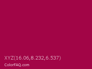 XYZ 16.06,8.232,6.537 Color is a normal rose color and the nearest color is Pink Raspberry #980036. Hex code #a20546 and RGB value is rgb(162,5,70). In RGB color space, this color is composed of 64% red, 2% green, 27% blue, In CMYK color space, this color is composed of 0% cyan, 97% magenta, 57% yellow , 36% black , In HSL color space, this color has a hue angle of 335° , 94% saturation and 33% lightness.